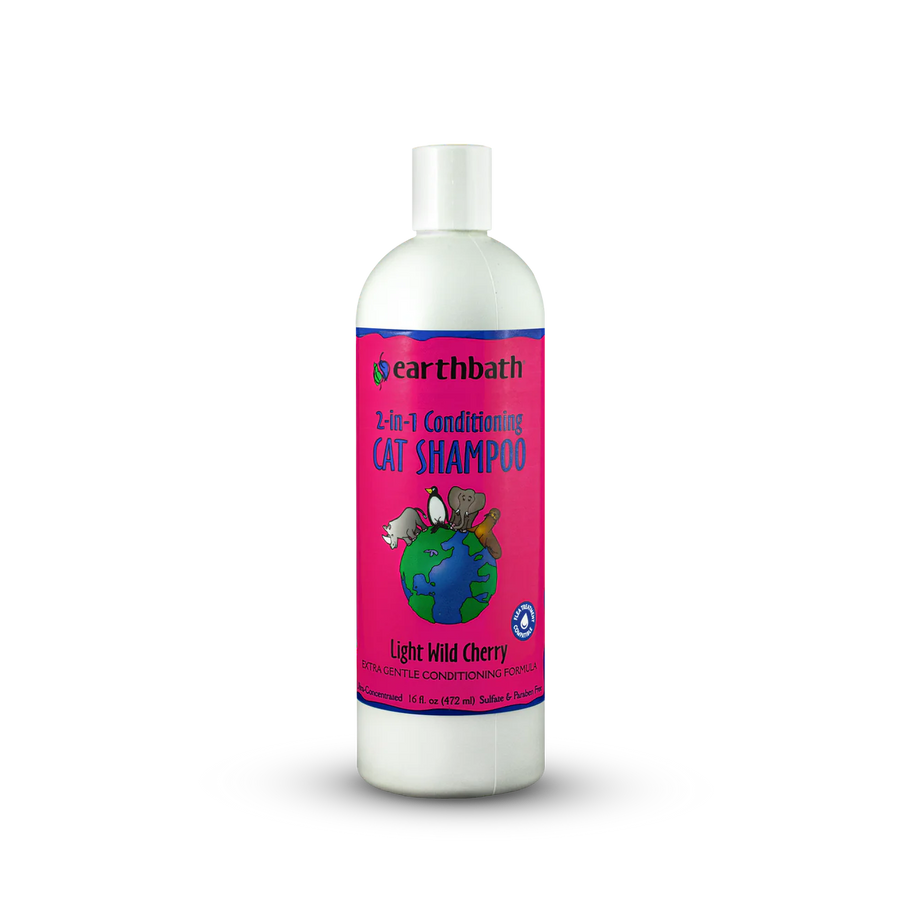 earthbath® formulated this extra gentle, pH-balanced, 2-in-1 conditioning shampoo for our finest furred feline friends. Gentle conditioners and organic aloe vera soften the coat, re-moisturize the skin, and add manageability, brilliance, and shine. Our ultra-mild coconut-based cleansers and the subtle scent of wild cherries will leave her smelling fresh and deliciously clean. Will not wash off topical flea applications. Safe for all animals over 6 weeks old.
